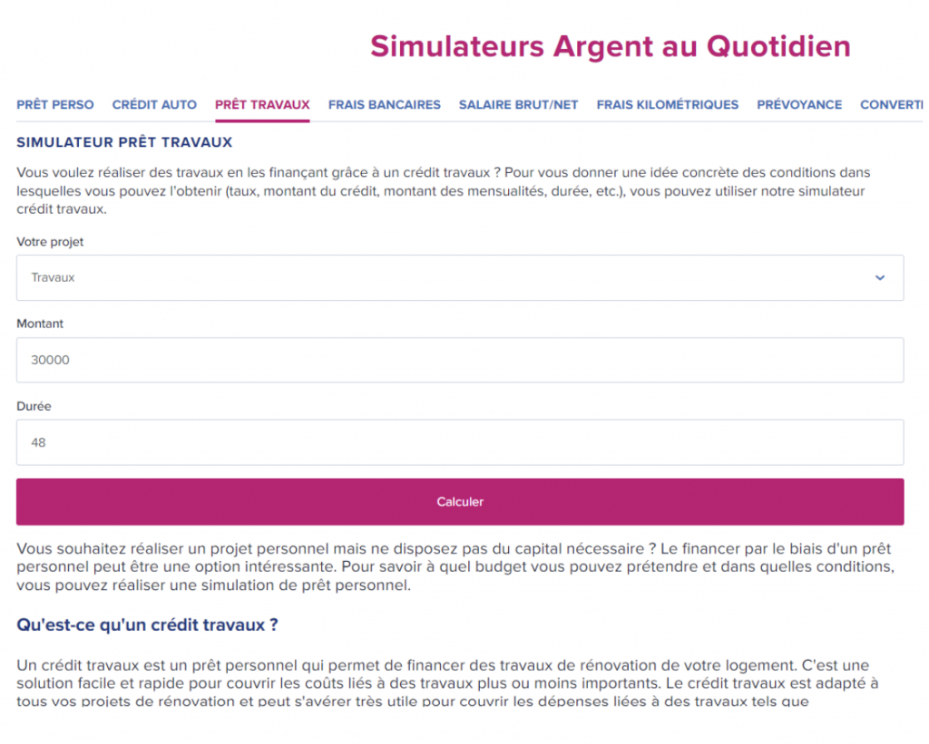Le simulateur de prêt travaux de Boursorama est un outil pratique et facile à utiliser. Il vous suffit de renseigner le montant souhaité, la durée de remboursement, et quelques autres paramètres. Par exemple, pour un prêt de 15 000 € sur 7 ans, le simulateur vous donnera une estimation des mensualités, généralement autour de 200 € par mois, avec un coût total de 16 800 €. Ce simulateur est essentiel pour comparer différentes options de financement et choisir celle qui convient le mieux à votre projet.